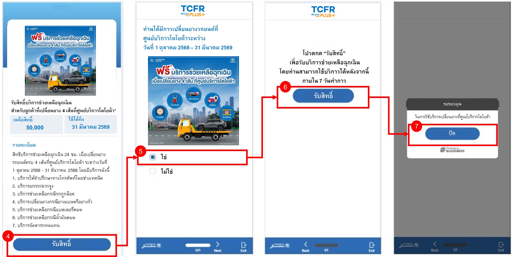 - กดเลือกคูปอง “บริการช่วยเหลือฉุกเฉิน สำหรับลูกค้าที่เปลี่ยนยาง 4 เส้นที่ศูนย์บริการโตโยต้า”